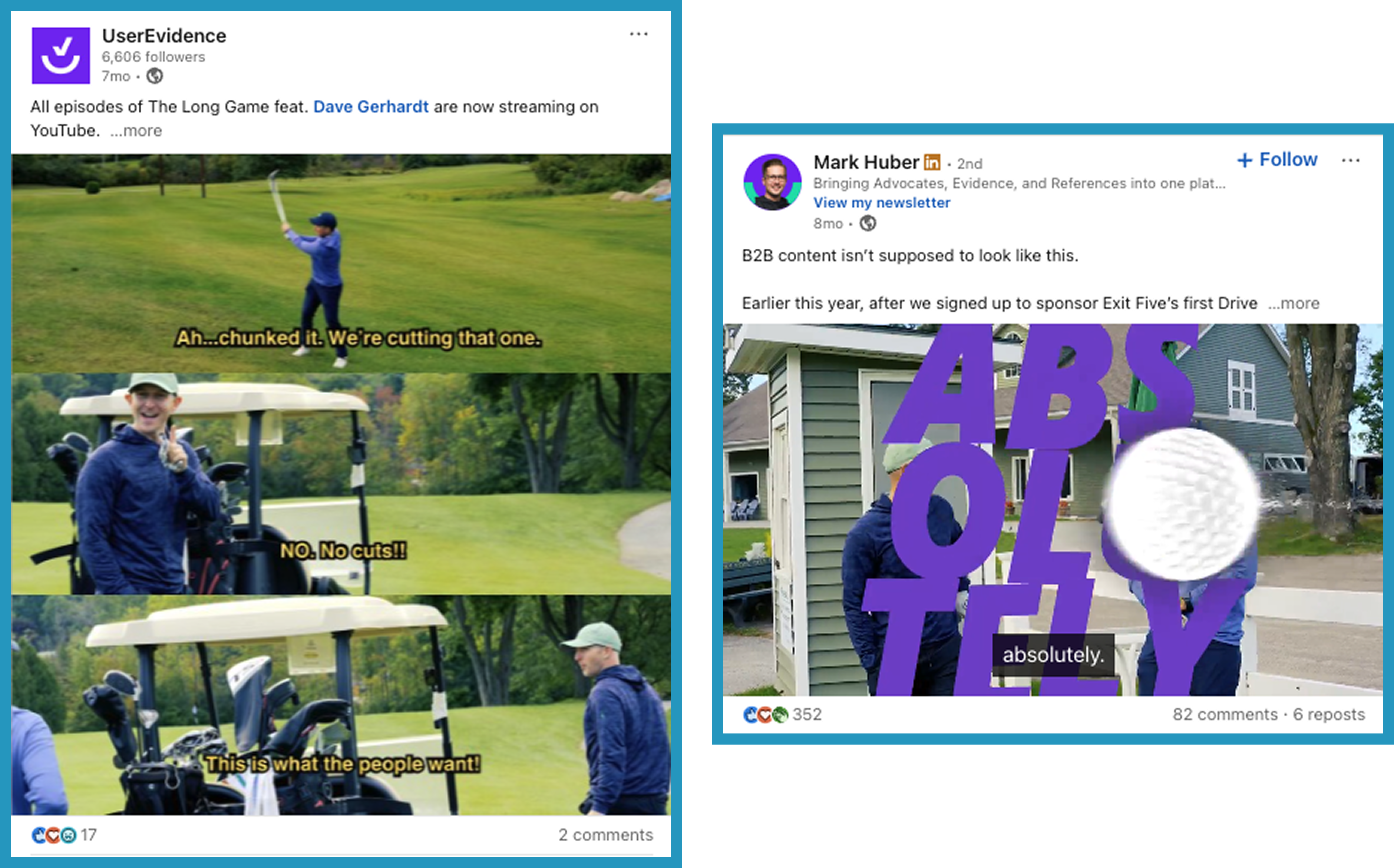 4. Built-in amplification that doesn't feel forced. There's a big difference between asking a marketing leader to do another podcast interview versus asking if you can come film them playing golf in Vermont or skiing in Jackson Hole. One feels like work, the other feels like an experience worth bragging about. So then when Dave or Evan share these episodes on LinkedIn, they're not just sharing yet another podcast appearance – they're sharing this cool, creative project they got to be part of, and something they genuinely want their audience to see. And that makes distribution a breeze.