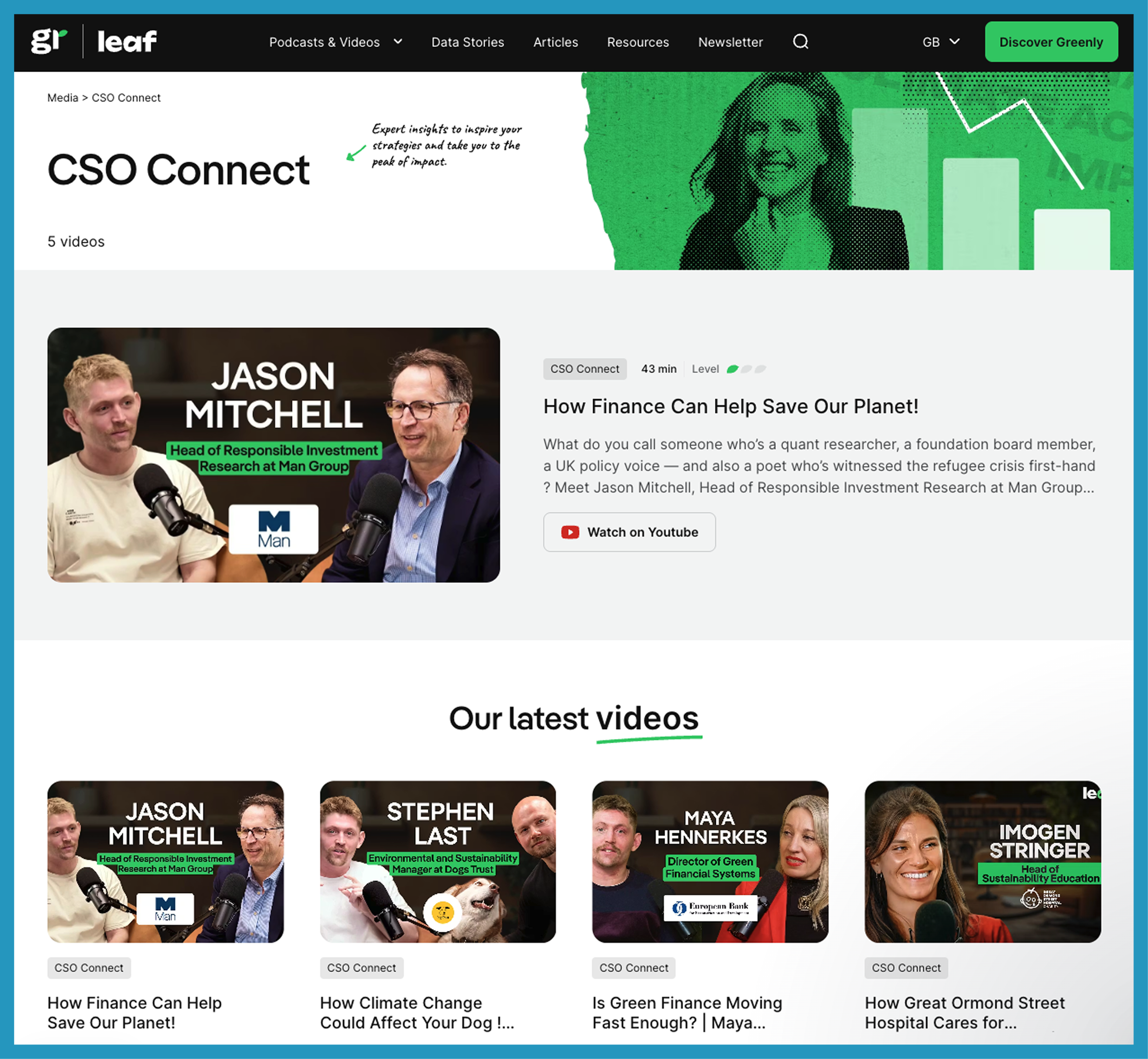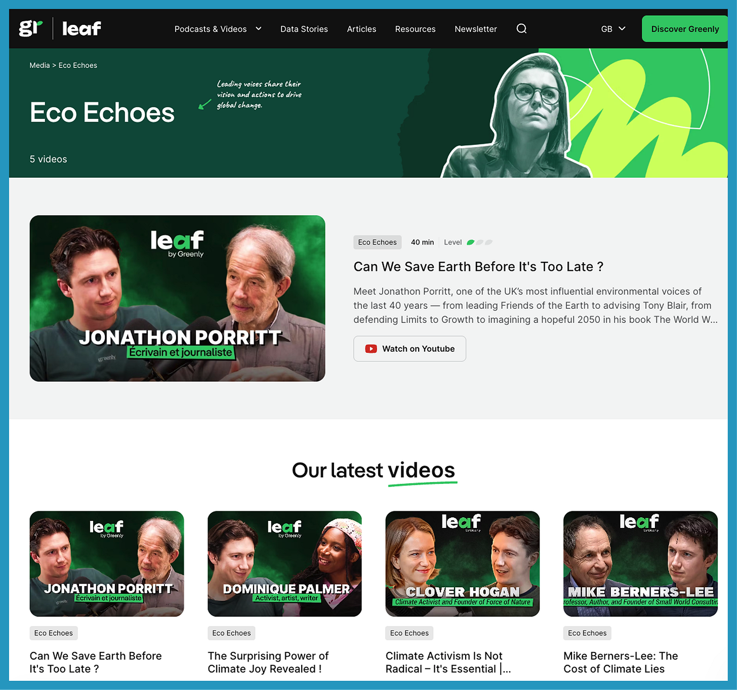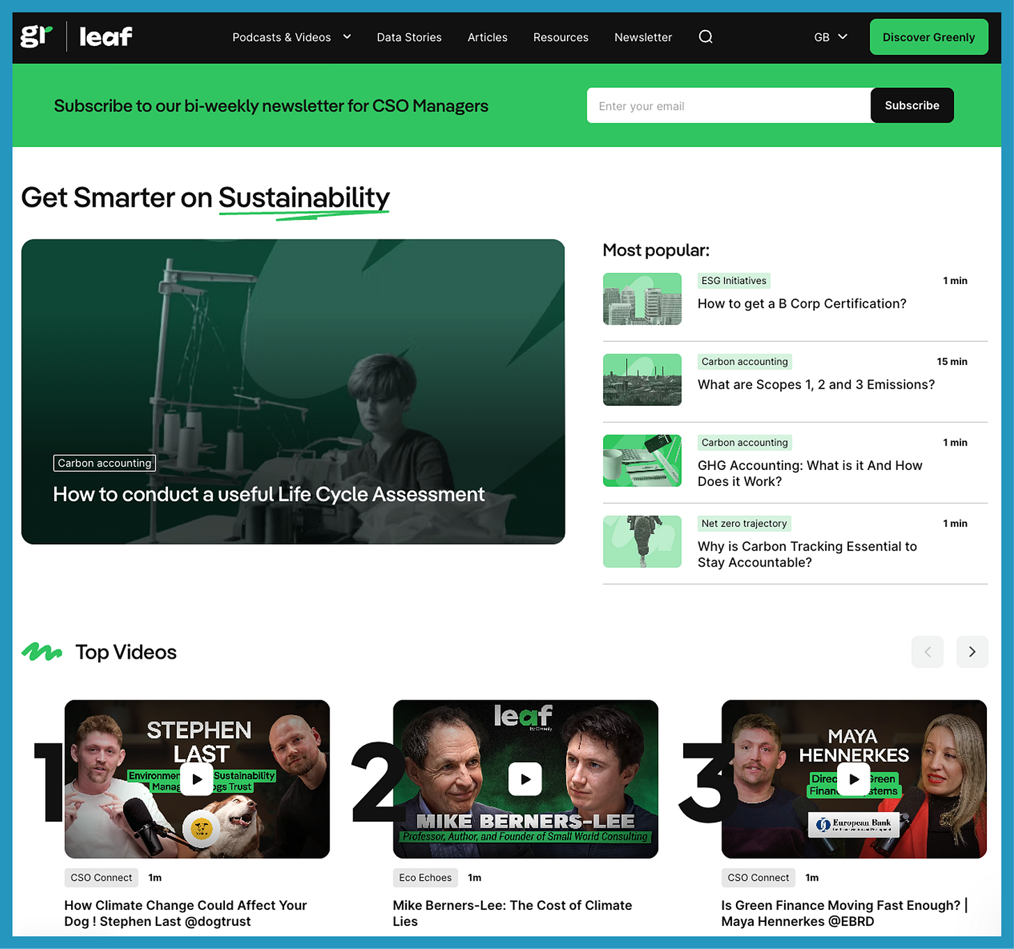 And critically, both podcasts sit under Leaf Media by Greenly – a separate mini-brand that includes podcasts, data stories, articles, and a newsletter, all hosted on a microsite that keeps the media content separate from the main Greenly brand.