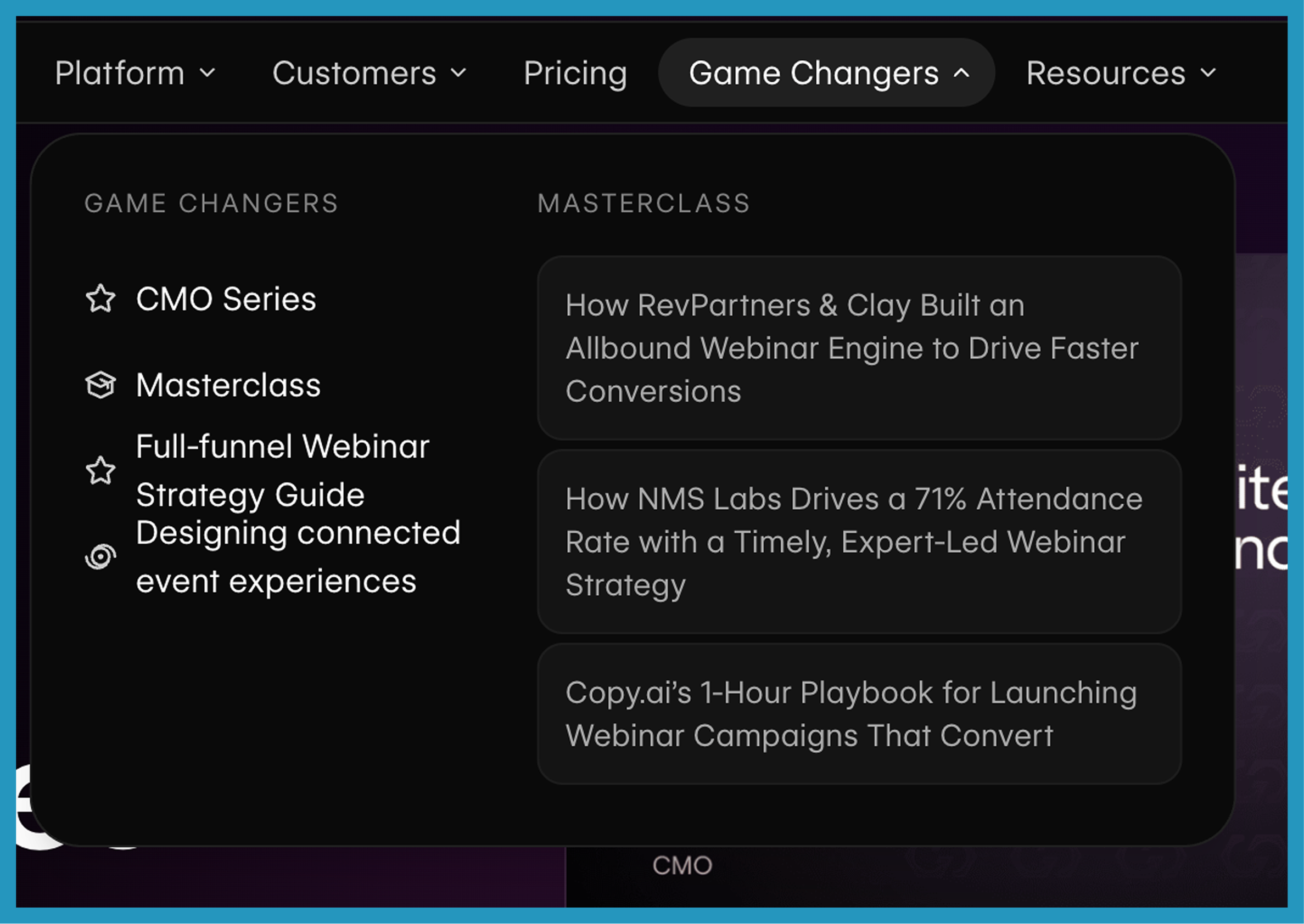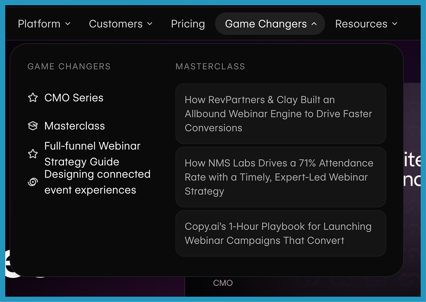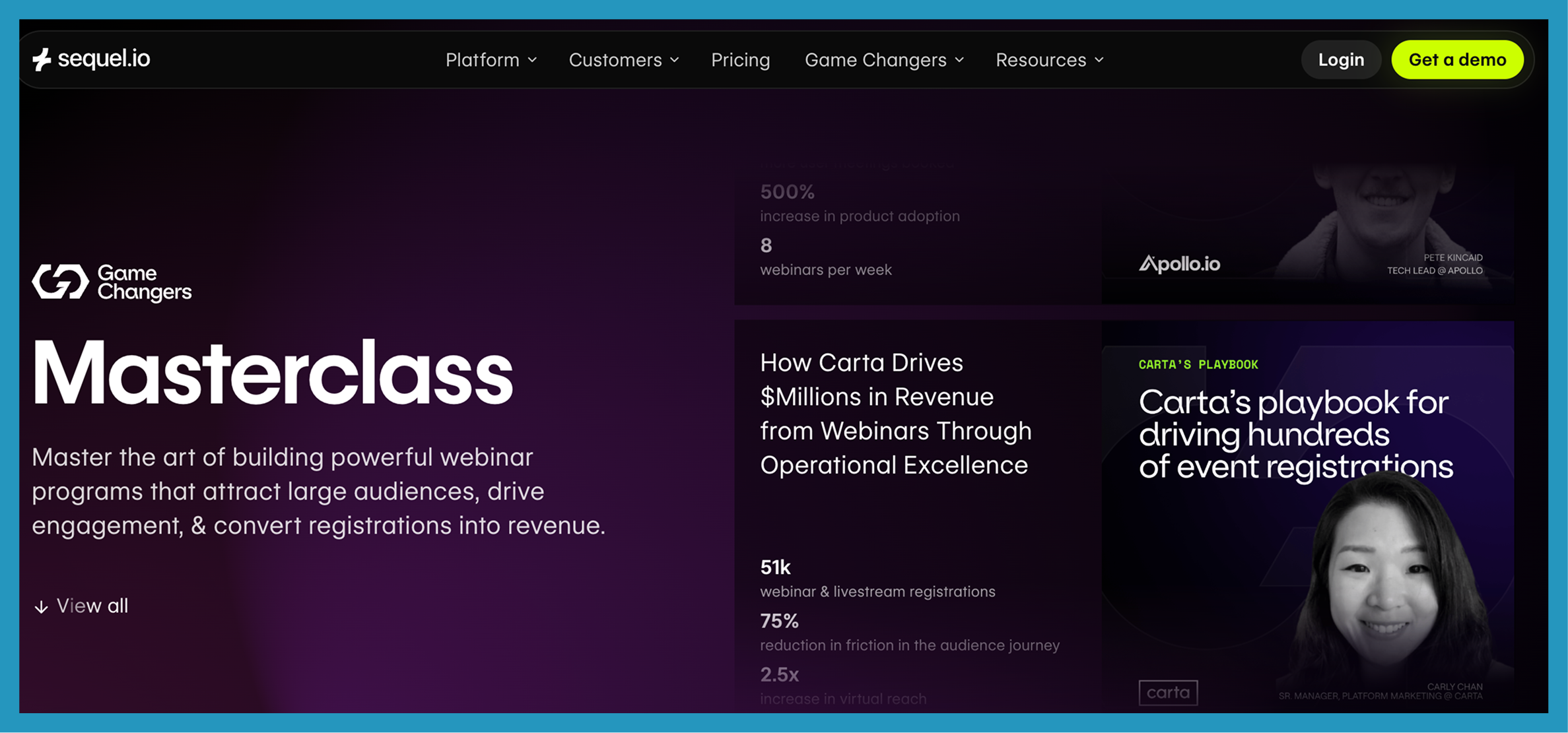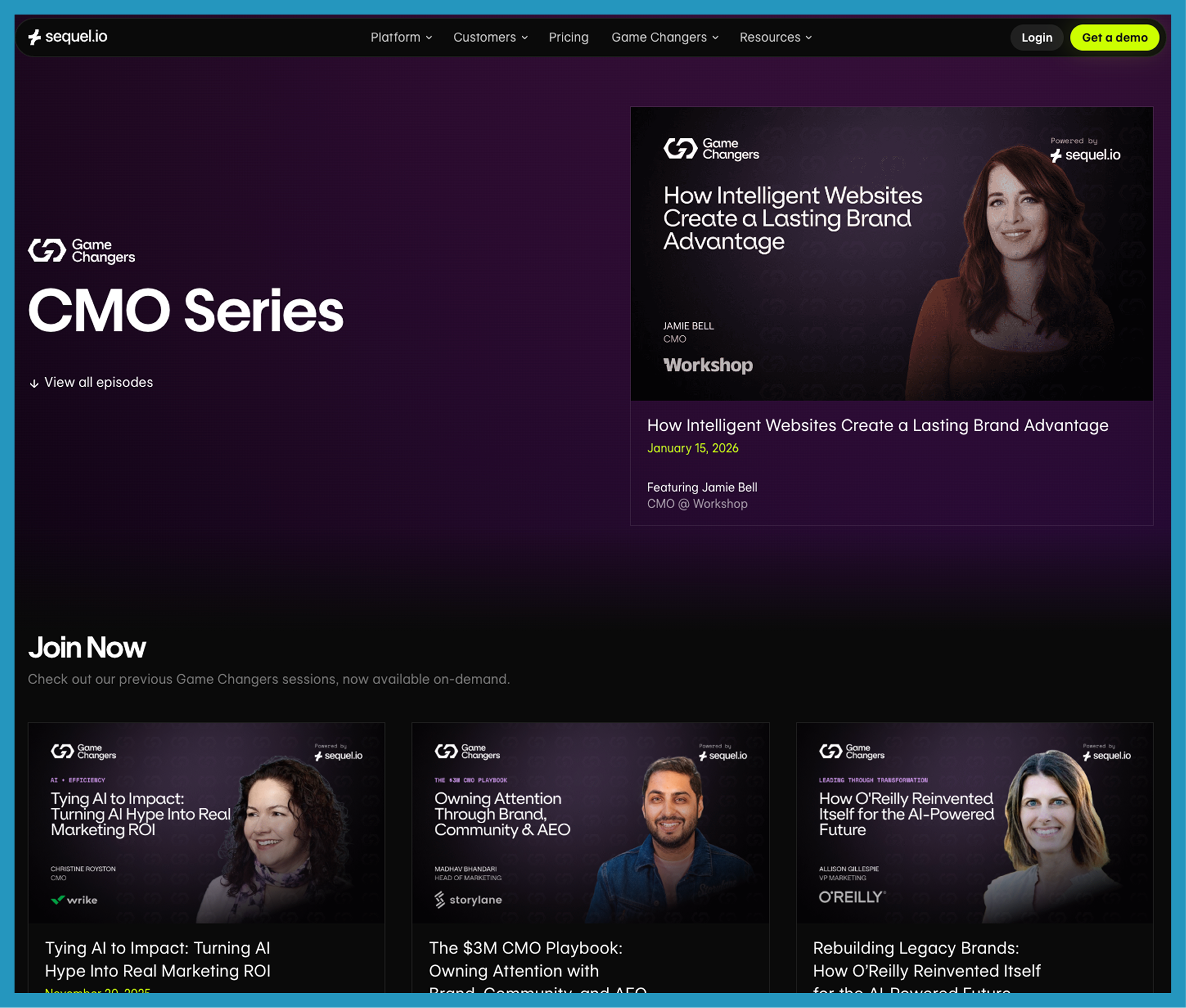 The mini-brand approach gives them room to expand. By establishing Game Changers as its own brand identity rather than just “Sequel webinars,” they created space to add more series underneath that umbrella. The CMO Series and Masterclass Series feel connected but serve different purposes – top-of-funnel thought leadership and mid-funnel demand generation. It’s focused expansion rather than scattered diversification.