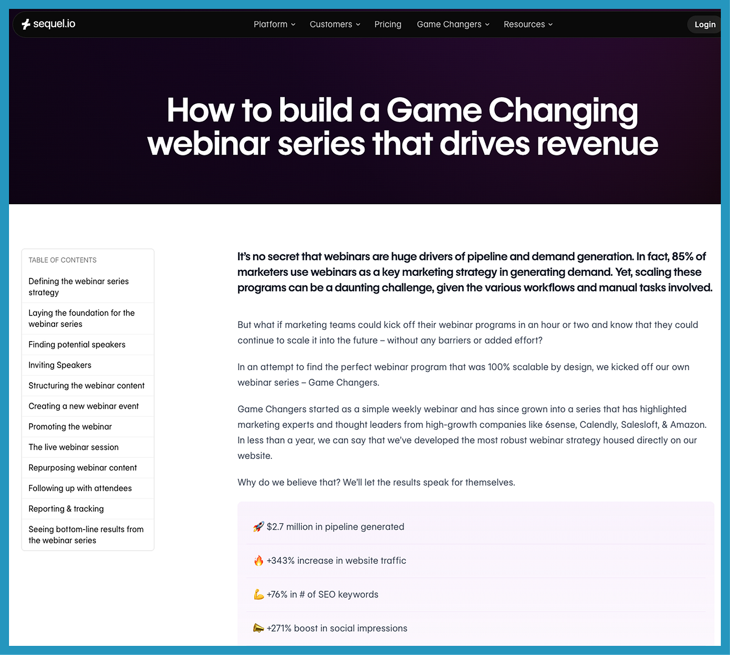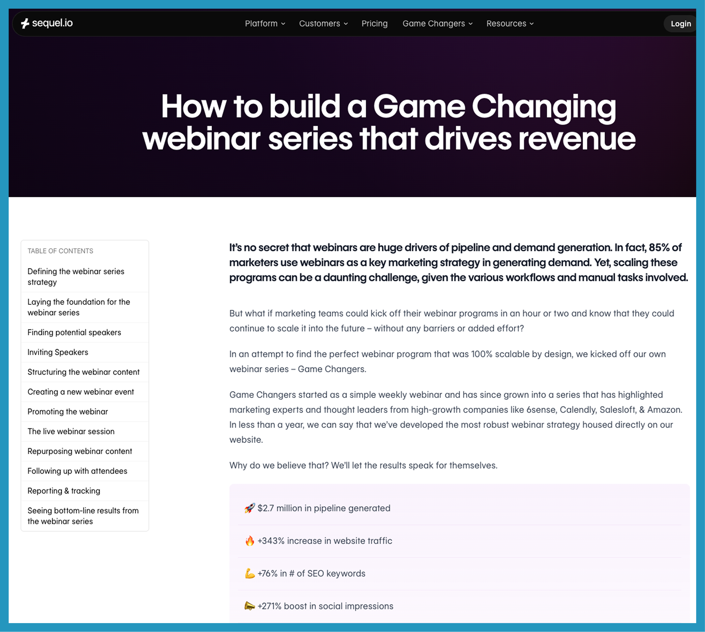 This is mid-funnel content showing how other companies use webinars in their marketing – essentially case studies for Sequel’s product, but formatted as educational webinar content rather than sales collateral. These webinars then also get repurposed into written articles, walking through real strategies and showcasing real impact.