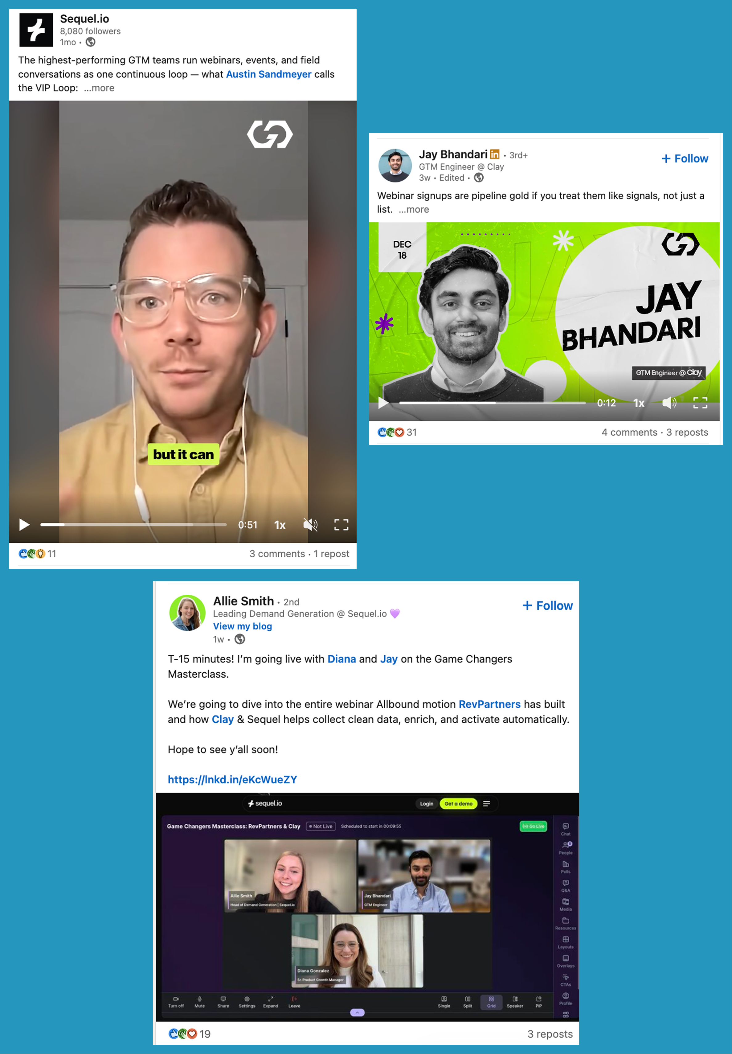 Each live webinar becomes on-demand replay content (still gated), a written summary, LinkedIn posts (both by internal accounts and via guest speakers too), video clips.